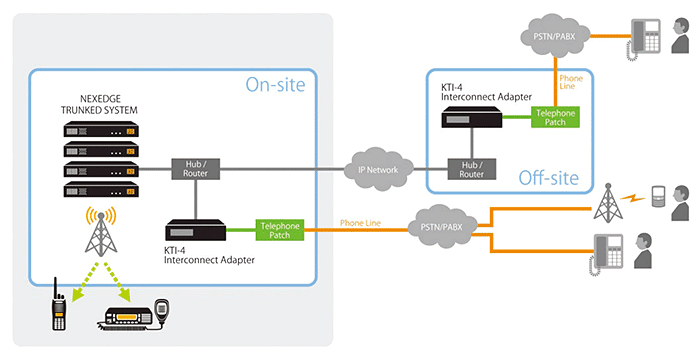 Connected to a NEXEDGE® trunked system, the KTI-4 Telephone Interconnect Adapter converts analog voice to/from digital, enabling two-way communication between a telephone and a radio. It connects to an analog PABX/PSTN system through analog telephone patch equipment such as the Zetron Model 735 and Zetron Model 30 (availability varies by region).